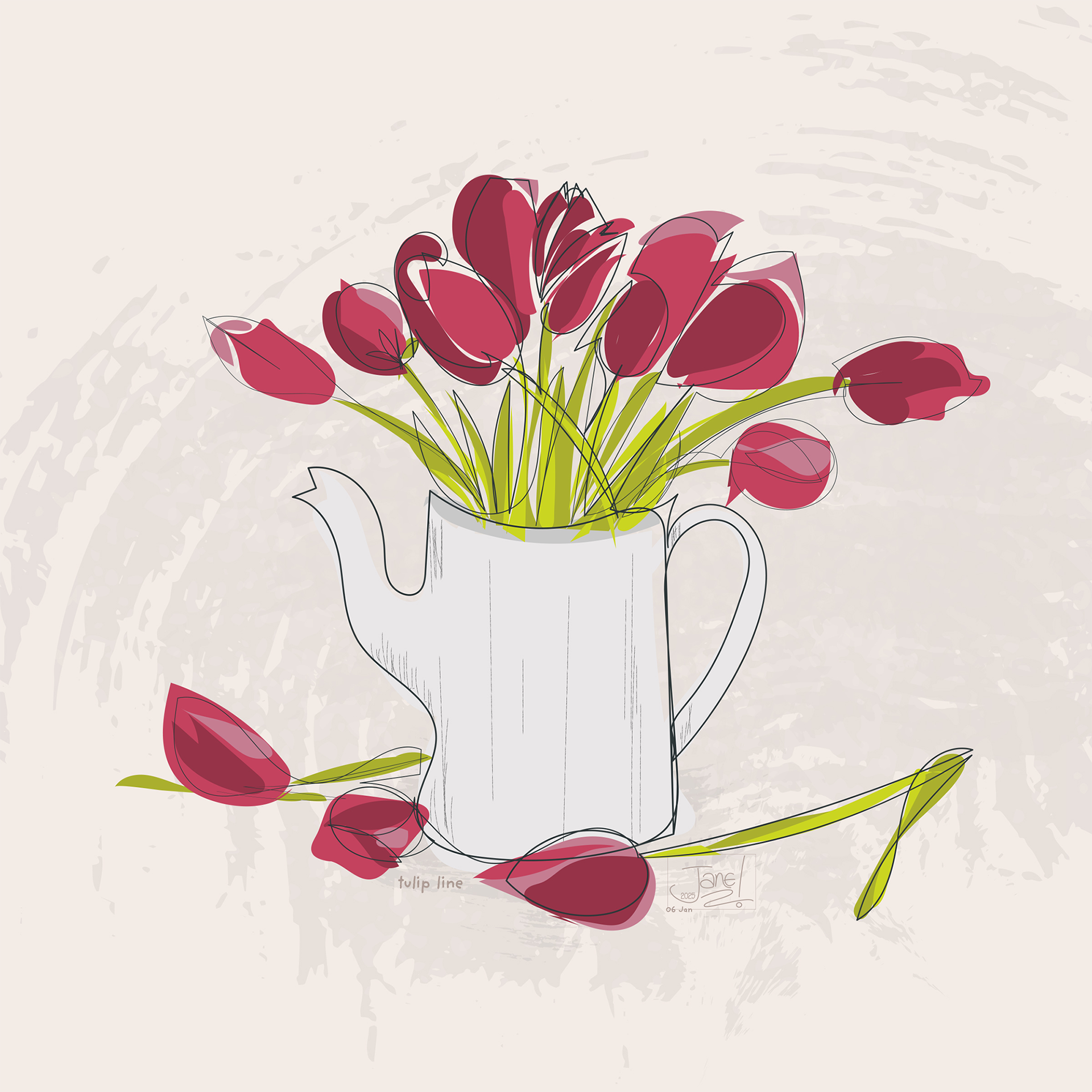 Continuous line drawing, not something I am good at. I think this turned out so well because the reference of a bunch of tulips in a big metal watering can was simple. Also, it combines my love of vector lines but with colour and a bit of texture.