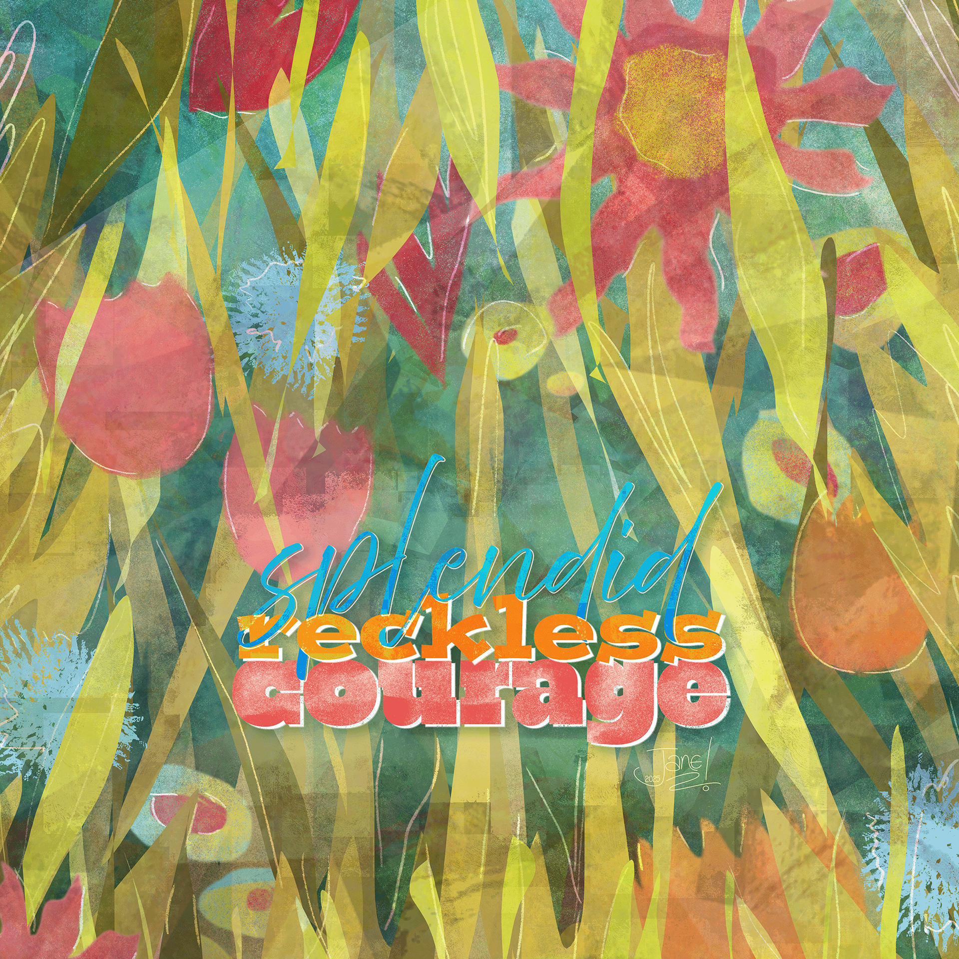 It was the phrase splendid reckless courage that I felt drawn to make something with. For a couple of months this sat unfinished because I really didn't like it. My abstract flowers are mere blobs, my leaves too pointy, the lettering isn't right; that background isn't bad though, nice teal blue-green going on there!