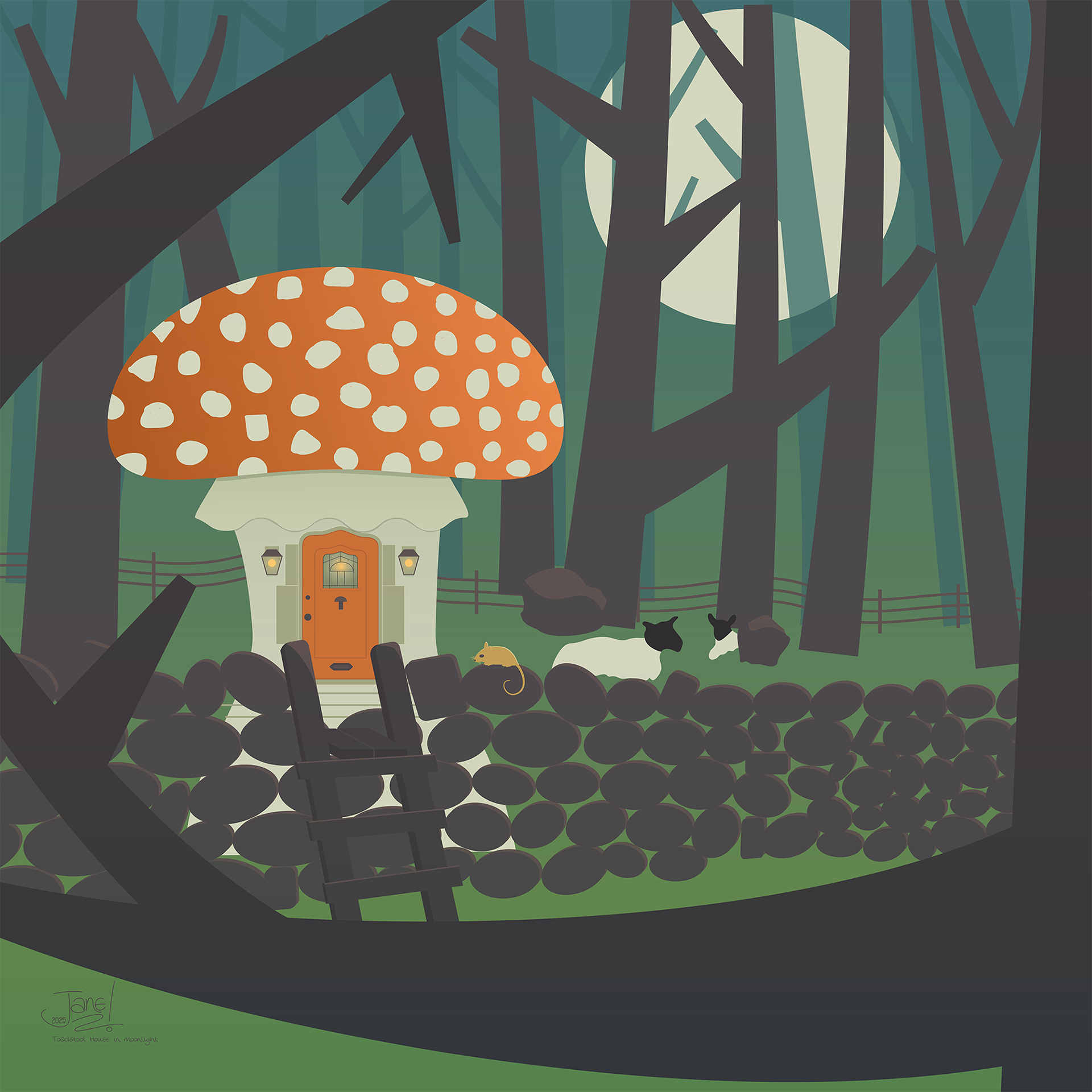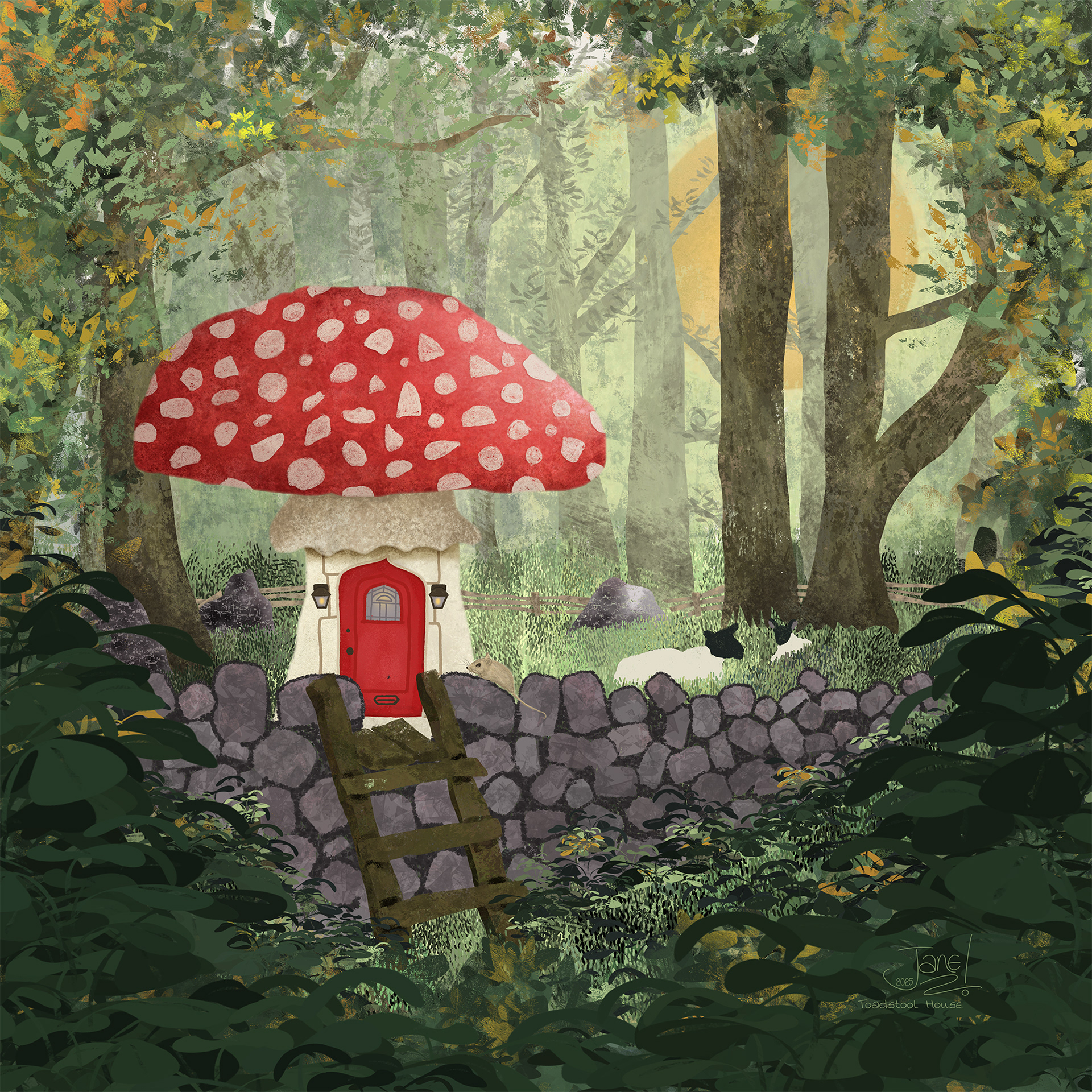 Maddy Bellwoar runs an Art Club, every Wednesday afternoon on Twitch with various themes depending on the season. This was Autumn; and it was the stile over a dry stone wall that inspired this idea of it leading to a toadstool house in the forest.