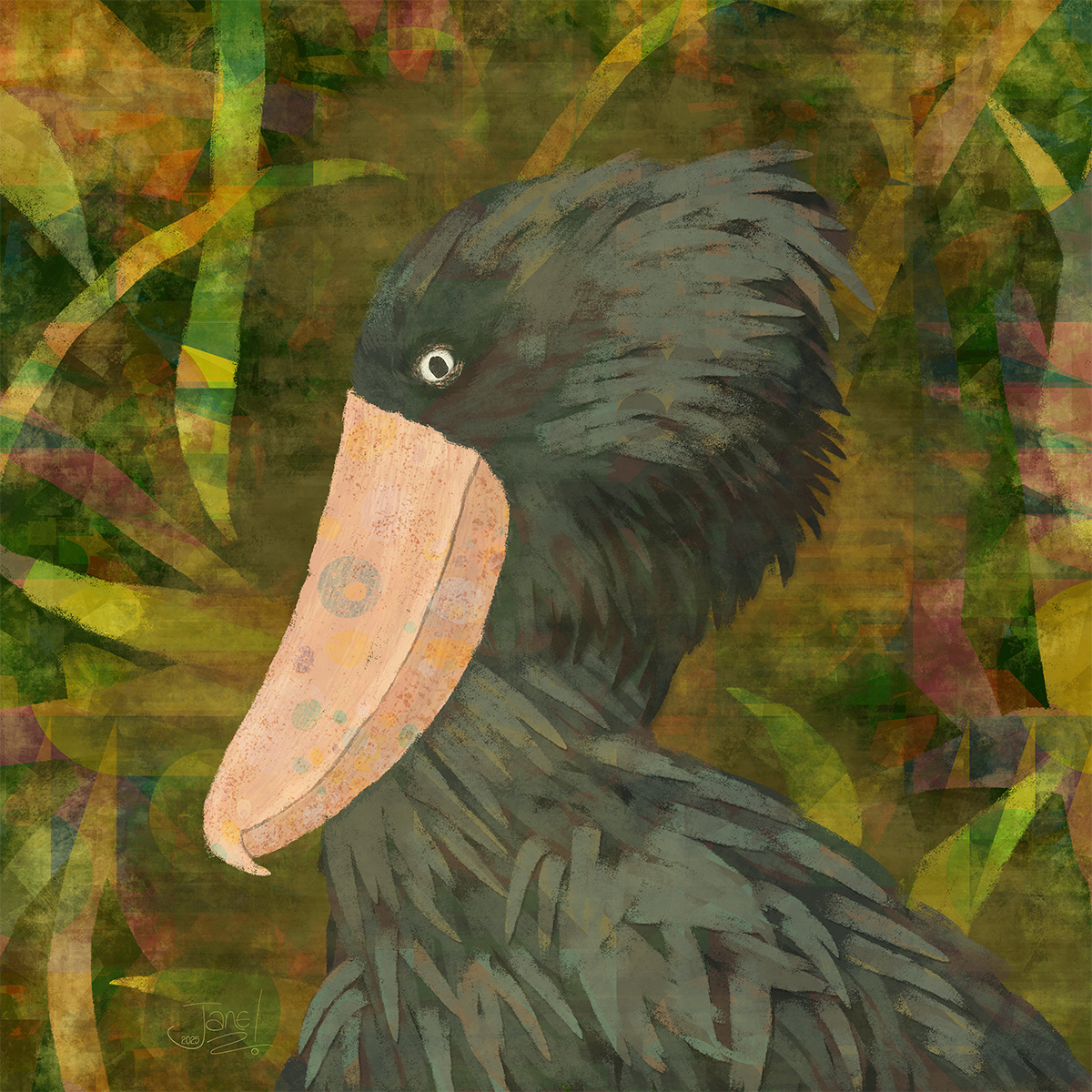 Another Art Club effort; the subject was birds from the photo references I chose this beautiful shoebill. I love his feathers, his beady eye and the chance to do a fabulous green abstract background.