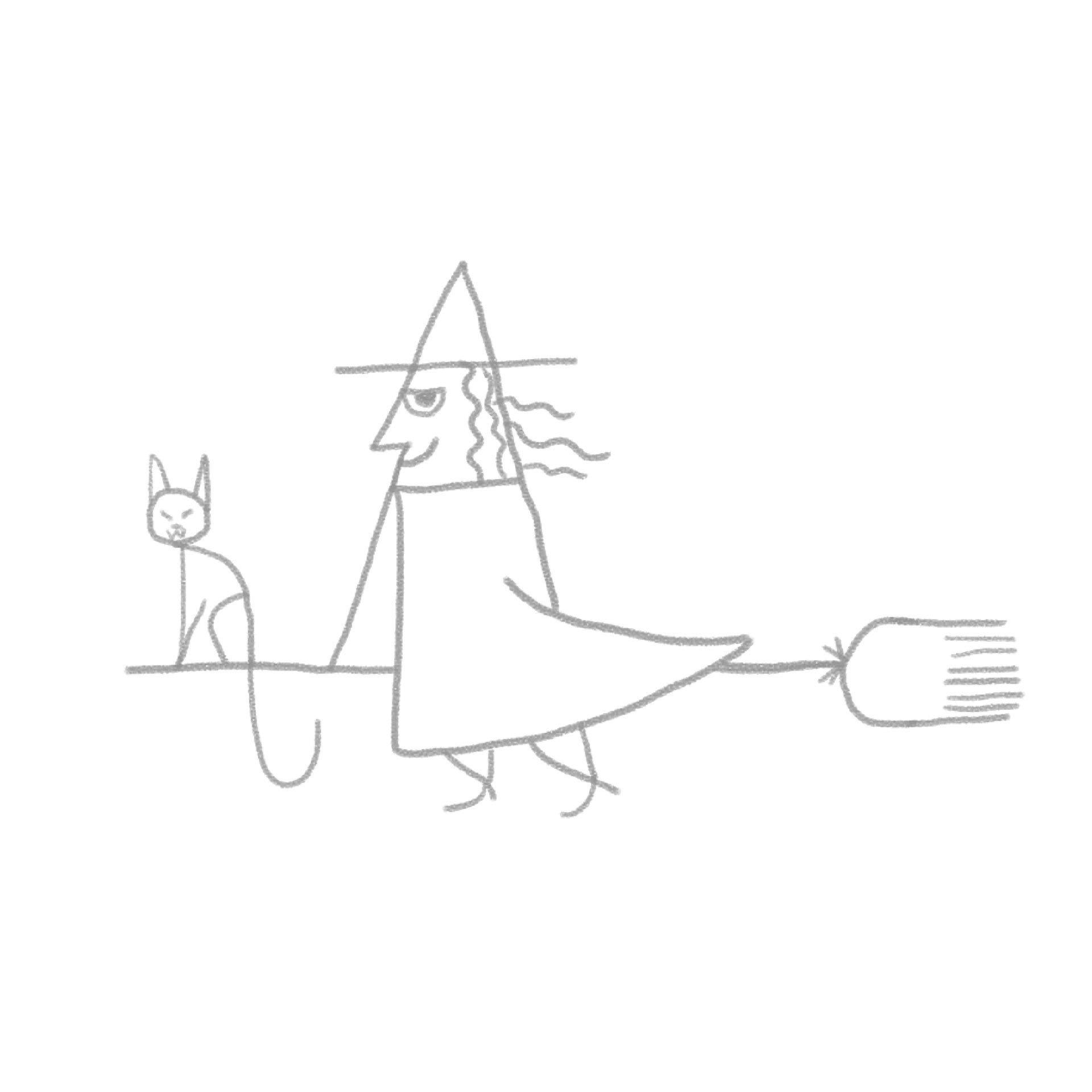 Again, a sketch from Kyle's Draw-A-Long provides the practice subject. It's October, an appropriate time for a witch to fly on her broom, accompanied by her faithful cat. As usual, it starts with my rough sketch which then becomes simple shapes and lines in Illustrator.