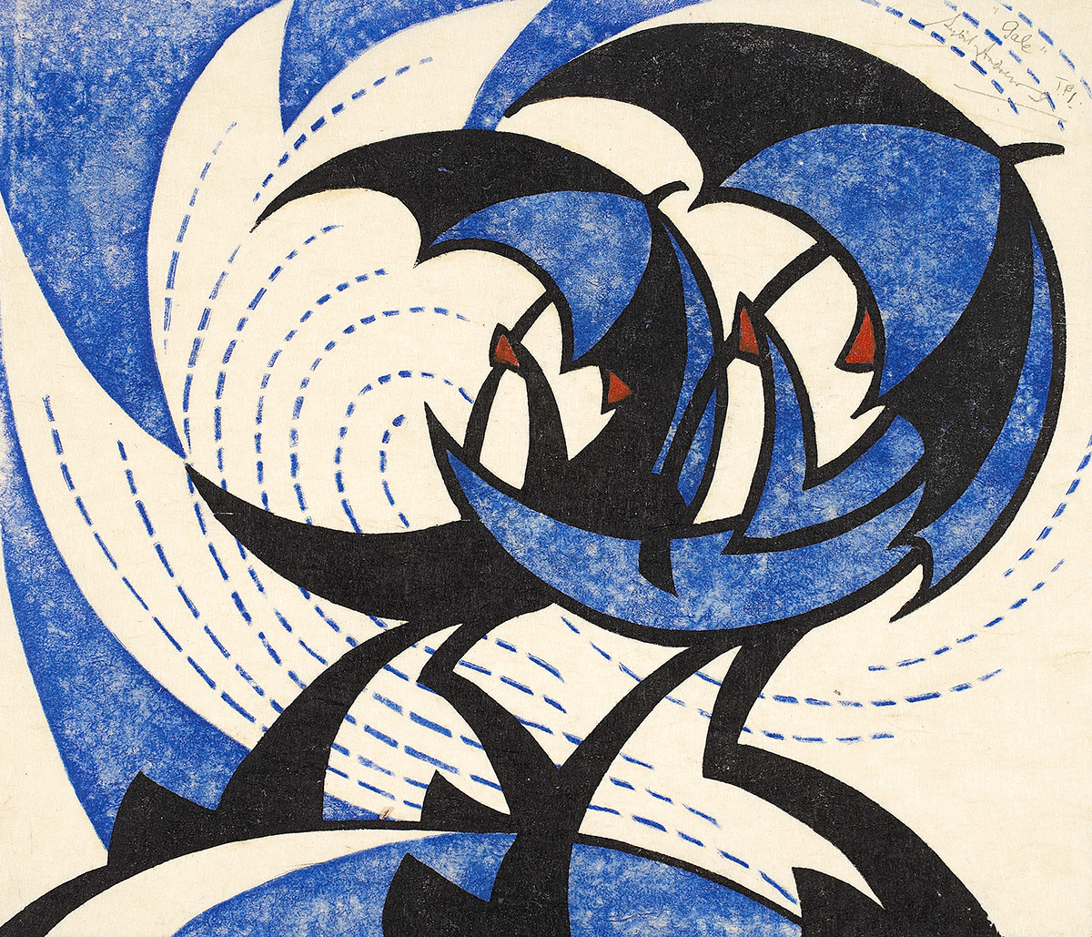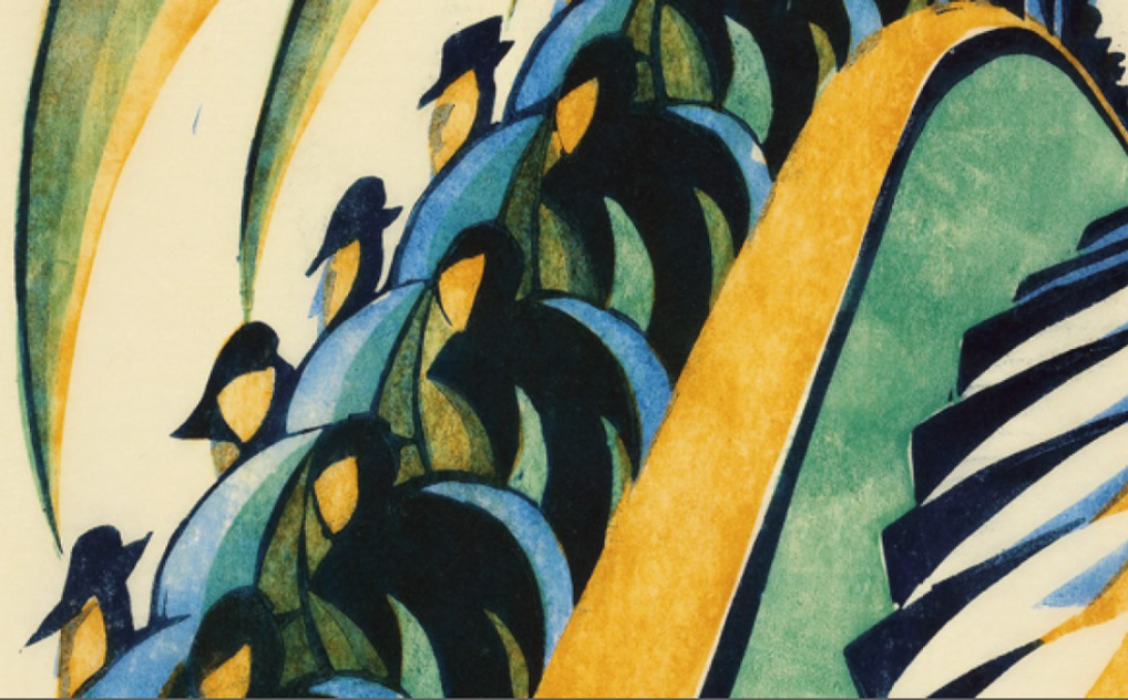 Gale by Sybil Andrews, two figures taking a walk on a windy day. The people are depicted as a crescent moon shape, with umbrellas using the same shape. Their legs are exaggerated with large feet. The wind is symbolised by swirled, dotted lines, and the figures leaning towards the right as if walking into the strong wind. This piece uses only two colours, blue and black, with an off-white background.
